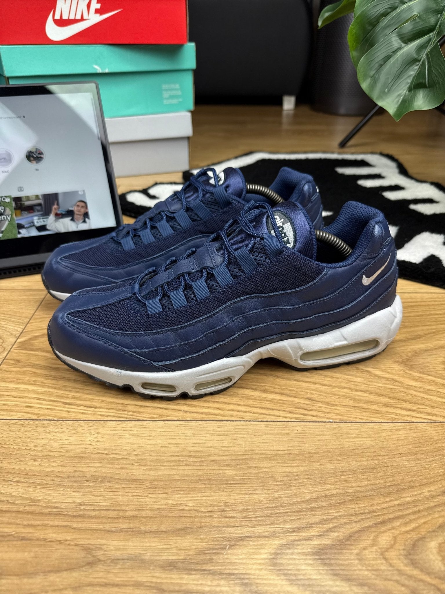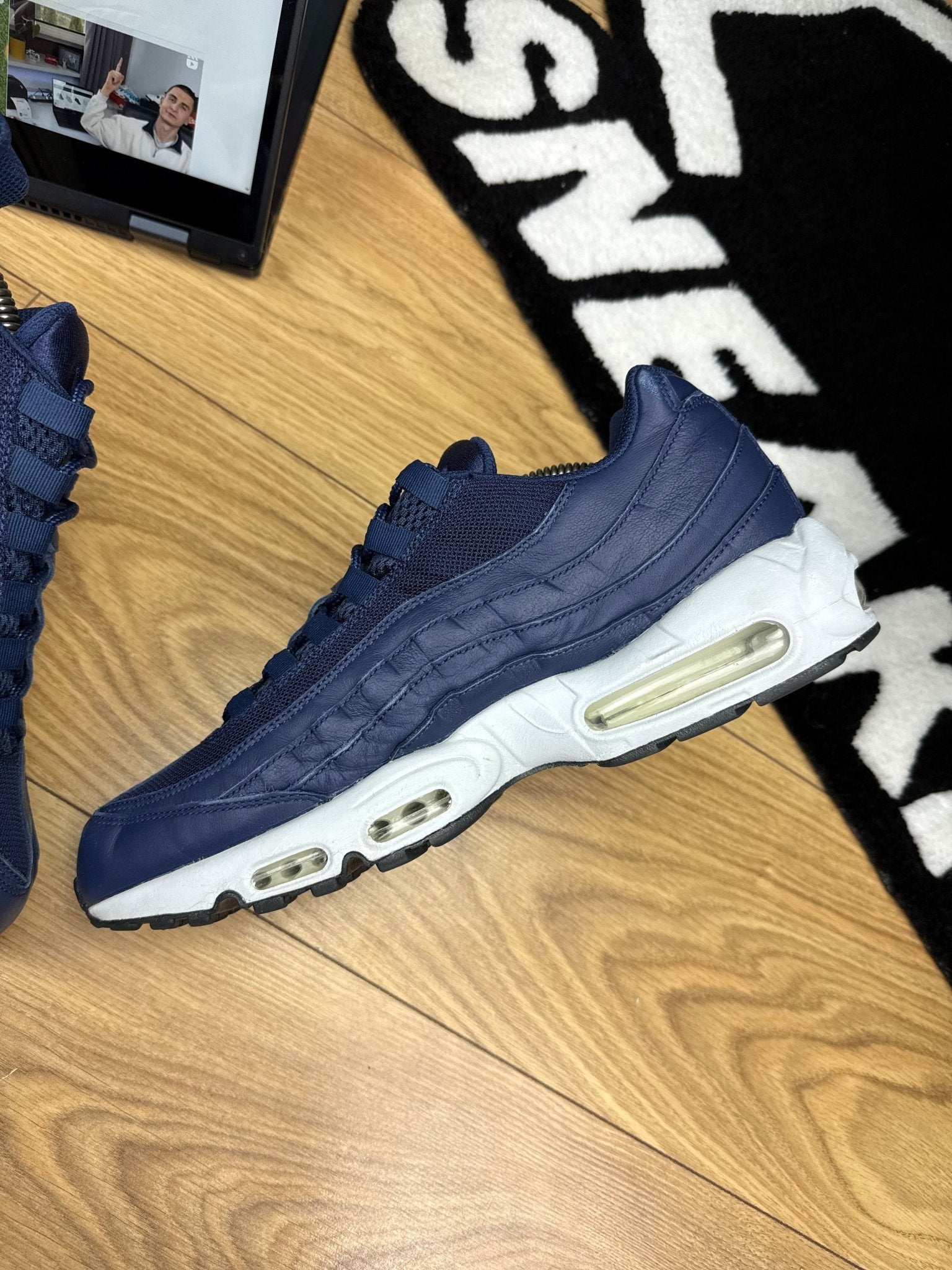 ✔️ Materials: Upper: natural leather (navy blue) and textile elements; sole: EVA foam with visible Air unit and white rubber bottom