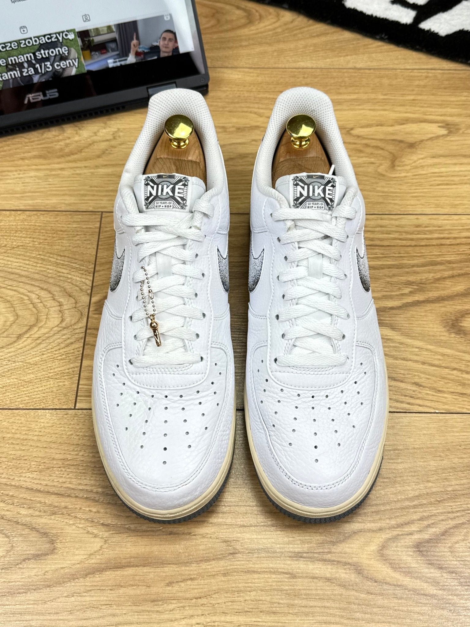 Model Nike Air Force 1 Low “Classics 50 Years of Hip-Hop” (kod DV7183-100) łączy klasyczną sylwetkę AF1 z unikalnymi elementami celebracyjnymi: cholewka z białej skóry, kontrastowy „speckled” Swoosh i panel pięty, ozdoba mikrofonem zawieszona na sznurowadłach oraz detale „Nike Classics” na języku. Wydany 1 czerwca 2023 dla upamiętnienia 50 lat kultury hip-hop.