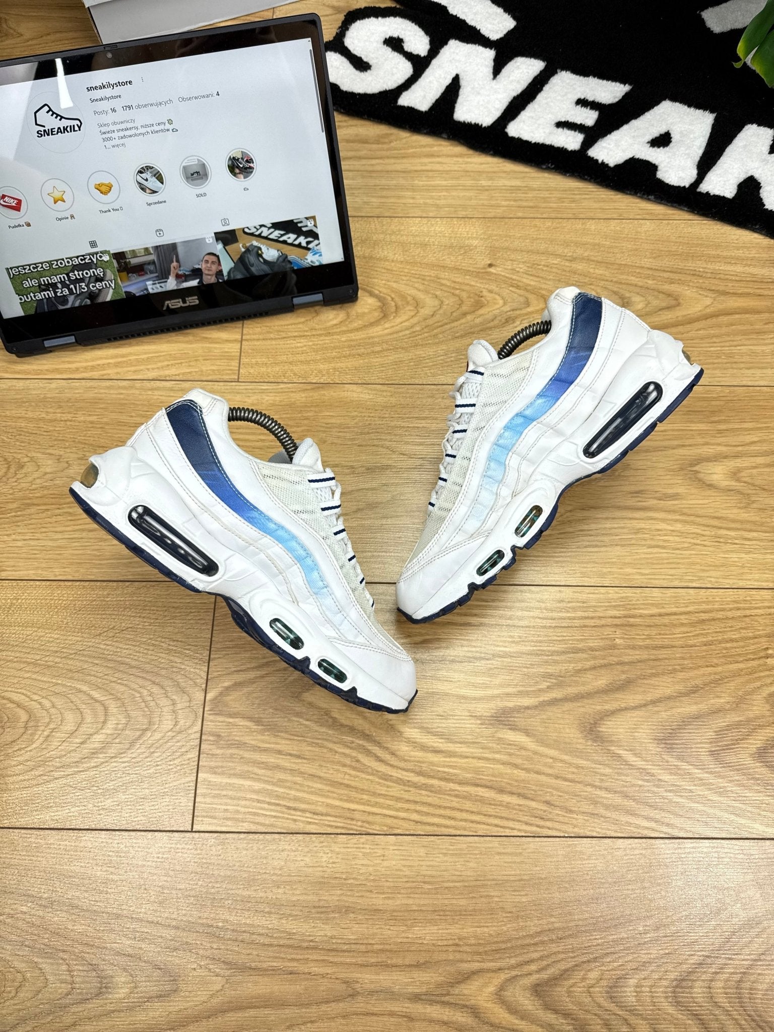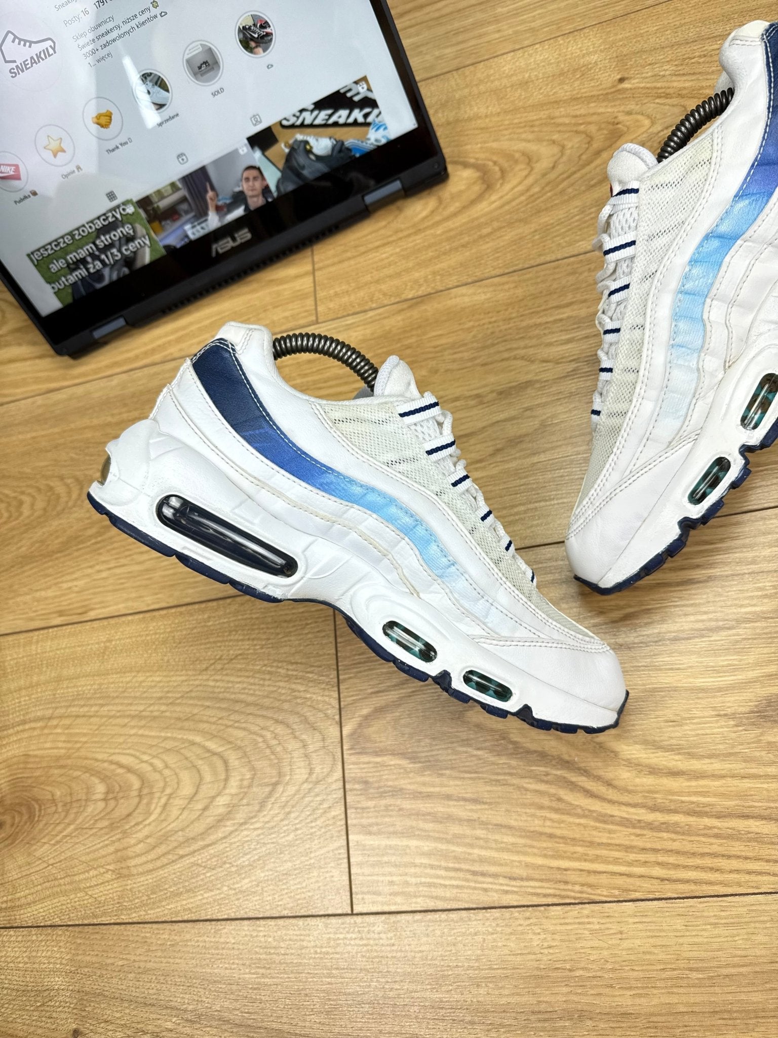 ✔️ Materiały: Cholewka: biała siateczka mesh i skóra; overlaye: gradient od bieli do blue void; podeszwa: pianka z widocznymi poduszkami Air w pięcie i przedniej części